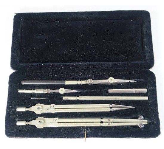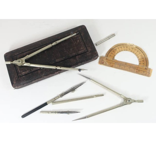 G642.)3rd RCH GERMAN NAVY NAVIGATIONAL INSTRUMENTS: cased set of course charting instruments being dividers and compass along with protractor. Compass has pencil lead for circumscribing. Both the compass and divider set are Kriegsmarine 'eagle/M' property marked with swastika. Set has all six instruments and comes in 3x7" hard leather-covered case that's lined inside with black velvet. Interior is fitted so as to perfectly accommodate each instrument. Case is intact and shows some wear and age. EXC++++