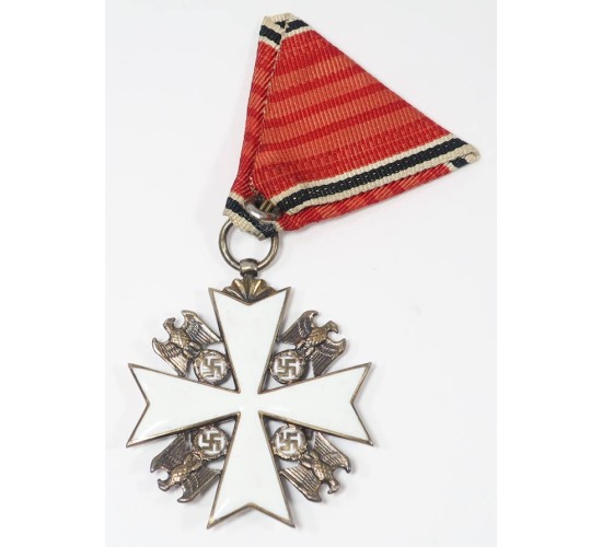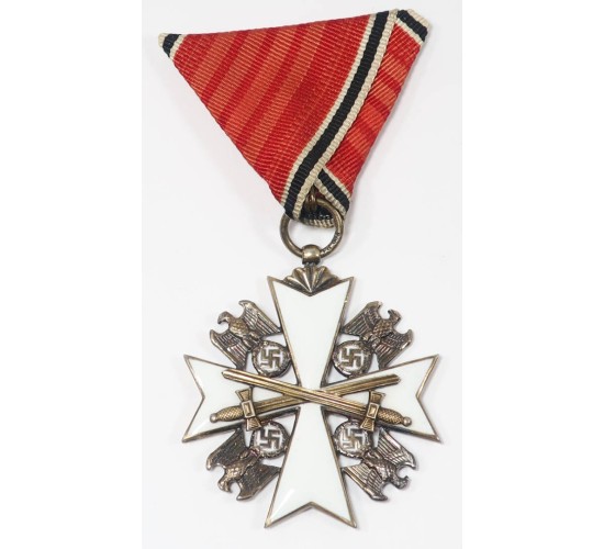 G643.)3rd RCH GERMAN EAGLE ORDER, AUSTRIAN MOUNTED RIBBON: a stellar period specimen, a gem. 44mm wide with genuine silver base, separately applied cross swords device. Flawless white glass enameling on both sides. Note too the national eagle motifs in each quadrant, white glass enamels too behind each swastika. At top is fan-shaped suspension and silver ring that's marked with maker's code '21' and silver content '900'. Austrian style tri-folded ribbon. Has that typical Austrian hook and eyelet mounting for ribbon. Just outstanding all around. EXC++++