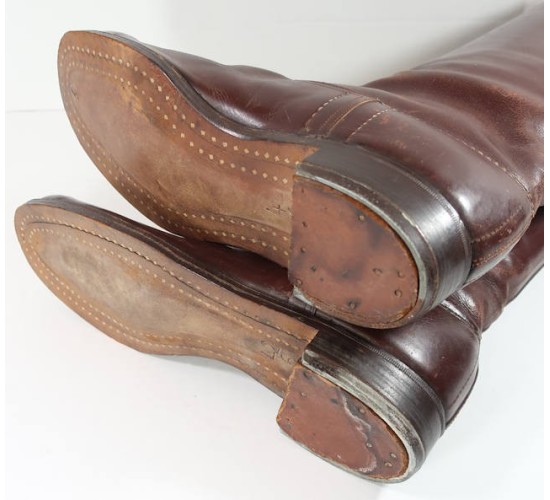 G648.)NSDAP POLITICAL LEADER'S RIDING BOOTS: magnificent matched pair of political leader's riding boots. Smooth russet brown leather, soft and supple and completely intact. 18" tall and 11 1/2" from the tip of the toe to the rear of the heel (measured on the bottom). With stacked leather heels having metal cleats at lower sides, brown leather soles. Die-struck on the undersides with European size '42   6'. Inside of each has canvas pull tabs and left side upper interior die-struck with 'Po' for 'Politischesleiter' (political leader) and date '1942'. Also marked with dated leather goods maker 'DIHLMANN 42'. EXC++++