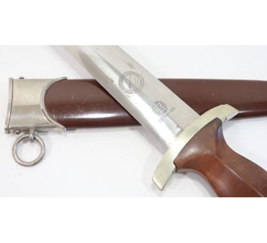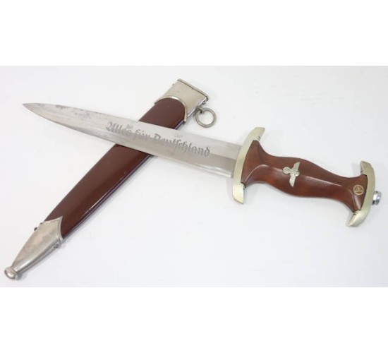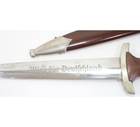 G650.)SA DAGGER, EARLY RZM TYPE: '1938' dated blade and double-marked, a lovely, early example. Shows a beautiful, mirror-like, nickel-plated blade. Minor in/our wear to surfaces from scabbard action. Bold and deep 'Alles fur Deutschland' motto. Blade shows some light surface blemishing from moisture, no rust nor any oxidation toning. Reverse has crisply etched maker's logo being large motif showing fist grasping spear and 'KLITTERMANN 7 MOOG, G.M.B.H.' and 'HAAN b./SOLINGEN'. Also etched with RZM logo and maker's code 'M7/29 1938'. Note that the cross-guards are the early nickel-silver type. Flawless dark fruitwood with perfectly inset national eagle motif and enameled SA button above. Cross-guard to grip fit is snug, no major gaps. No cracks to wood nor any chips. Scabbard is RZM type smooth brown enamel finished, really nice and intact. Just a few scuffs and scrapes here and there; finish can easily be estimated as being 95% present and intact. No dents and all screws are present on scabbard fittings. Note too that the pommel nut is aluminum, a feature which is entirely consistent with an RZM model. Note the comments below taken from several internet sites. This is a gem quality dagger. Ask for more up-close and detailed photos should you care to study this gem more carefully before buying. EXC++++