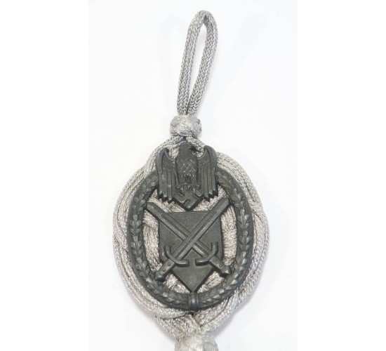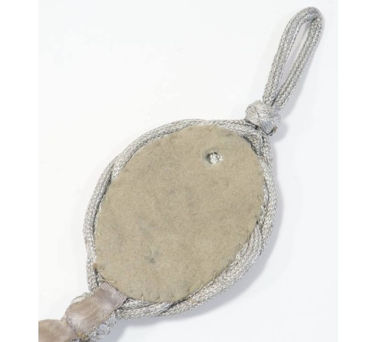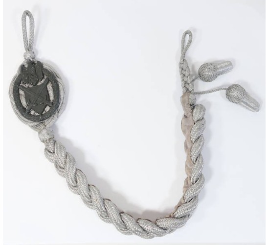 G652.)GERMAN ARMY MARKSMANSHIP CORD: with two bullion acorns for elevated level of marksmanship proficiency. Silver bullion braided cord with loops at each end, two acorns at base. Stamped silver alloy shield has toned to a gray cast. Behind plaquette is gray wool fabric (one small moth nip) and gray silk-like material on back of cord to prevent wear to tunic fabric. EXC++++