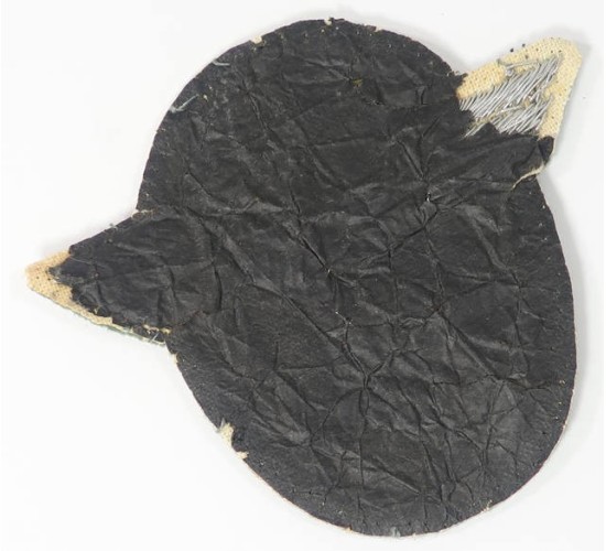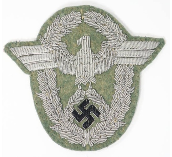 G659.)3rd RCH GERMAN POLICE OFFICER'S SLEEVE EAGLE: splendid example showing the finest hand embroidered bullion workmanship, removed from uniform sleeve. Impeccably executed silver bullion wire on cut-to-shape police green wool. Wings are done in a thinner silver wire for contrast while the eagle's body and wreath are executed in round, tubular wire. Nice. Wing shoulders are done in a hammered tinsel. Black hand embroidered swastika edged with silver wire. Base fabric is police-green wool and shows typical thin black tissue paper backing. No glowing under a black light. You can discern the stitching marks on the back from where sewn onto uniform. EXC++++