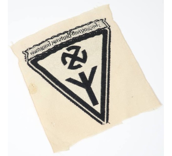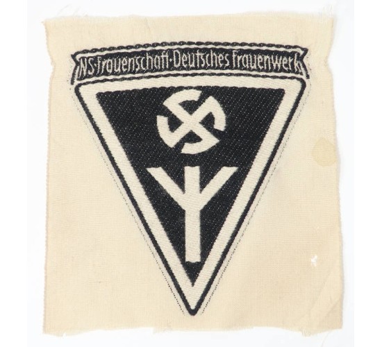 G660.)NSDAP FEMALE LEAGUE SPORTS SHIRT PATCH: as worn by the National Socialist Women's League. BeVo machine embroidered details on un-cut 4x4" white cotton fabric. Shows 'life rune' at base and runic, mobile swastika. At top is title 'NS-Frauenschaft-Deutsches Frauenwerk' (National-Socialist Women's League, German Women's Volunteer Work). Shows minor age and wear, one tiny hole. Does not glow of course. EXC++++