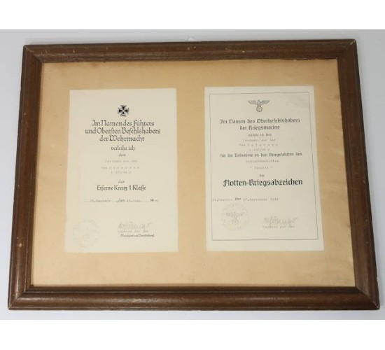 G663.)TWO 3rd RCH AWARD DOCUMENTS NAMED TO SAME GERMAN NAVAL OFFICER: two formal award documents mounted to a backing board and with old wooden frame. Obviously done many years ago as the backing tape and board are ancient. Both 5x8" documents are pasted to board. Named to KM officer 'Leutnant zur See Max Petersen' (leutnant zur see='naval lieutenant'). First document is for the 1939 Iron Cross 1st Class and is dated at the French coastal port of 'St Naziere den 18.Juni 1940'. With Kriegsmarine issuing agency ink stamp and signed by 'Kapitan zur See'. Companion document is for the High Seas Fleet Badge 'Flotten=Kriegsabzeichen' and is dated '27.September 1941'. Shows that at the time he was served aboard the 'Schlachtschiffes Tripitz' (Battleship Tirpitz'). Shows a lot of age and wear and priced accordingly.