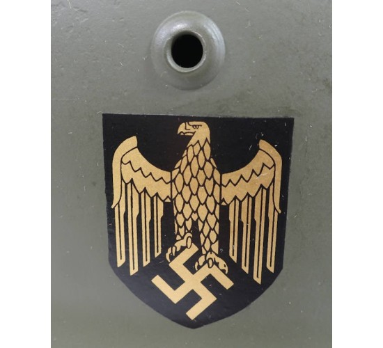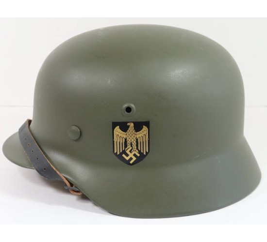 RD604.)KRIEGSMARINE DOUBLE-DECAL M35 STEEL HELMET: a really spectacular piece of restoration workmanship. The shell surely appears to be genuine period and has been expertly refinished, just a stunning helmet. Smooth field green finish is flawless and perfect as are both high quality decals. This is a true M35 steel helmet and has the early type, separately applied ventilation flanges. KM decal shows a pronounced golden shade. A high quality post-war coffee-with-cream pigskin leather liner, soft and supple and perfect too. Has zinc alloy liner band that's marked in several places (appears to be genuine period, '1943' dated?). Ink stamped with liner size '56'. Underside of shell is die-struck with familiar 3rd Rch maker's code and size 'Q64'. At rear is die-struck production code '797'. High post-war quality black leather chinstrap with gray-finished adjustment buckle. Tip of chin strap is marked with maker and date 'Ehrhardt & Kirsten, Leipzig 1940'. Rear helmet skirt is hand painted with owner's name 'Wilhelm Marschall'. Outstanding all around. EXC++++