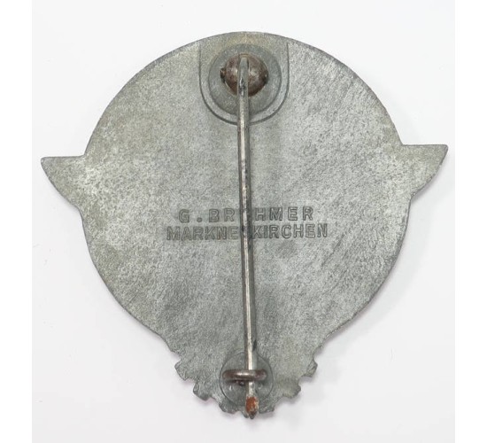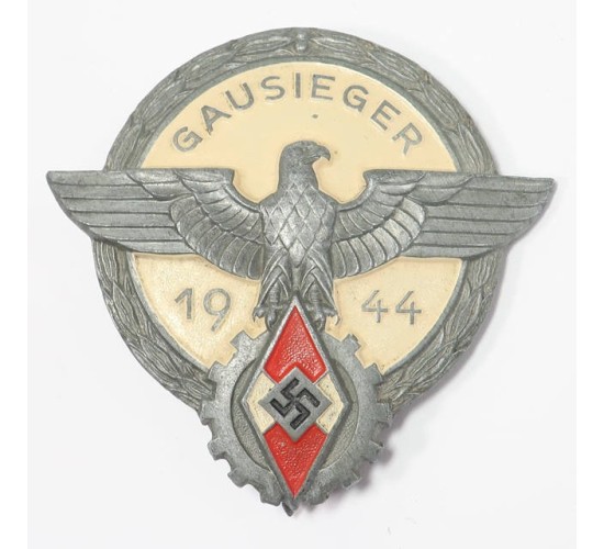 RD665.)1944 NATIONAL TRADE COMPETITION BADGE, GAUSIEGER WINNER: wartime, gray zinc alloy composition being 49mm wide from wing tip to wing tip. With painted details to HJ diamond and cream shade paint behind eagle. Details are for Gau level of competition. Reverse has ball hinge and pointed pin. Marked to maker in raised relief lettering 'G.BREHMER, MARKNEUKIRCHEN'. EXC++++