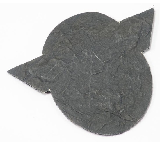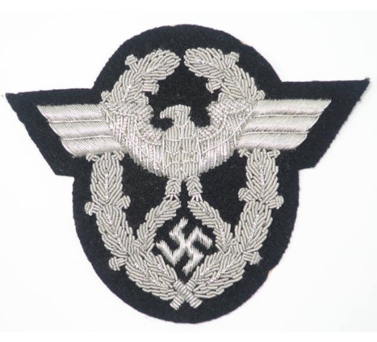 RD673.)POLICE OFFICER'S SLEEVE EAGLE ON BLACK: as worn by the German civilian police who patrolled with armored vehicles. Impeccably hand embroidered silver bullion wire details on cut-to-shape black wool. Sculpted and three-dimensional with round, tubular bullion wreath and eagle's body while the wing tips are a much thinner silver bullion thread for contrast. Hammered tinsel wing shoulders. Note too the thin black paper tissue backing which is common to genuine German bullion wire embroidery. Just outstanding. EXC++++