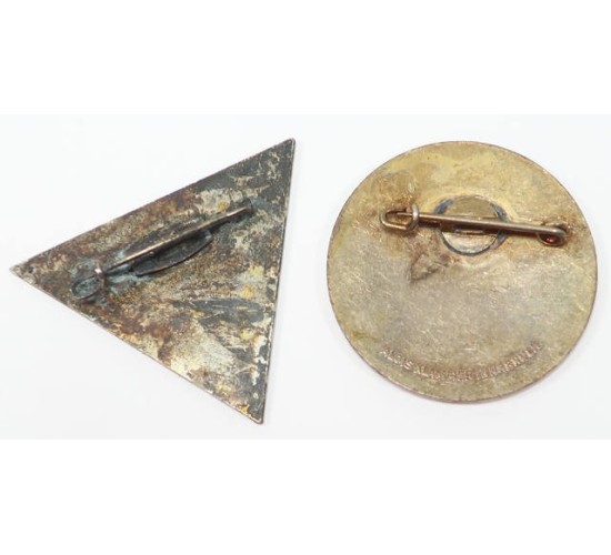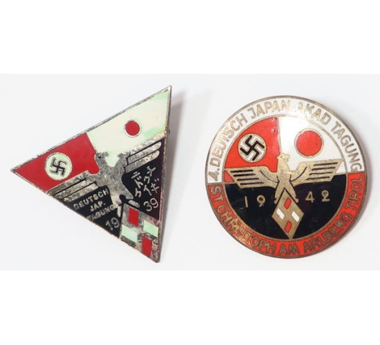 RD674.)TWO (2) GERMAN-JAPANESE YOUTH COMMEMORATIVE ENAMEL BADGES: two really fine old copies being the commemorative badges for the Japanese-German youth gatherings. One is dated '1939' and the other is from wartime '1942'. I do recall reading that the Japanese contingent arrived in Germany via Imperial Japanese Navy submarine! Both are fine glass enamel on nickel-silver base alloy and both are intended to deceive. Both have German national eagle with HJ diamond design and Japanese rising sun national flag. Round example is detailed with '4.DEUTSCH-JAPAN AKAD TAGUNG, ST CHRISTOPH AM ARLBERG TIROL'. This was for the 4th annual skiing and mountain/alpine events held that year. With Austrian maker on the back 'ALOIS KLAMMER, INNSBRUCK'. EXC++++