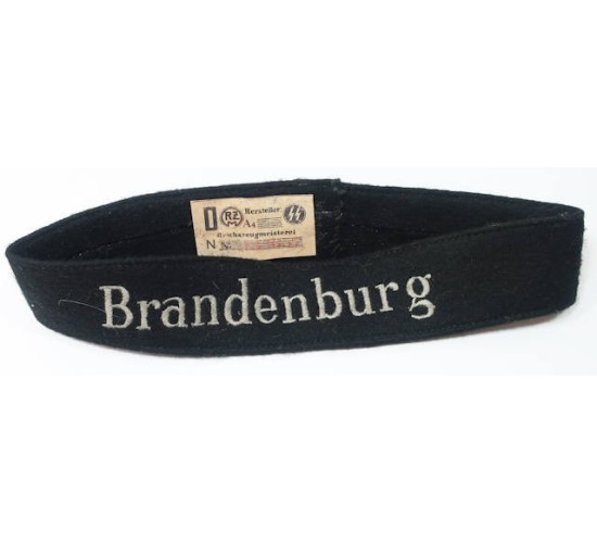 RD675.)SS-VT BRANDENBURG CUFF-TITLE: dangerous old forgery removed from a uniform and shows convincing age. Ends are still sewn together. Machine embroidered with gray thread details 'Brandenburg' for the SS-Totenkopf Brandenburg. Has aged paper RZM tag on the underside. Nothing on this cuff-title glows under a black light. As fine as any original. EXC++++