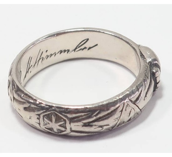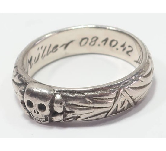 RD667.)SS HONOR RING: appears to be genuine silver composition. Well detailed and a fairly large size ; fits a normal ring finger. Inside is engraved with recipient's name and date 'A.Muller 08.10.42' and with Himmler signature. EXC++++