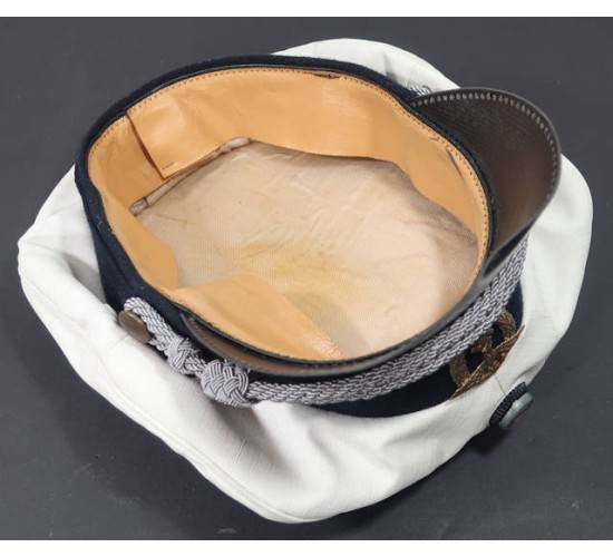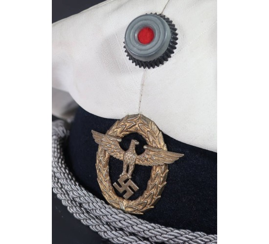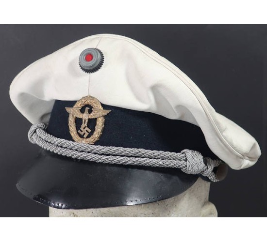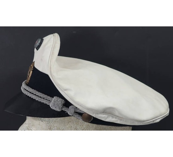 RD677.)WATER PROTECTION POLICE CRUSHER VISOR CAP: just and outstanding vintage copy and one made to screw you. Very convincing and would easily pass as genuine. Shows a fine crusher shape and profile. White nautical canvas top with navy blue wool cap band. On each side are white enamel finished ventilation grommets. At front are national colors rosette and gold-finished police eagle which is an original period, two-piece eagle. Cockade at top too is original period. With silver bullion officer's type chin cord. Black patent leather visor. Genuine coffee-with-cream leather sweat band, all stitching strong and intact. Inside of crusher is lined with aged and soiled off-white satin. Nothing on this cap glows under a black light. Just and outstanding old counterfeit, dangerous and clever. EXC++++