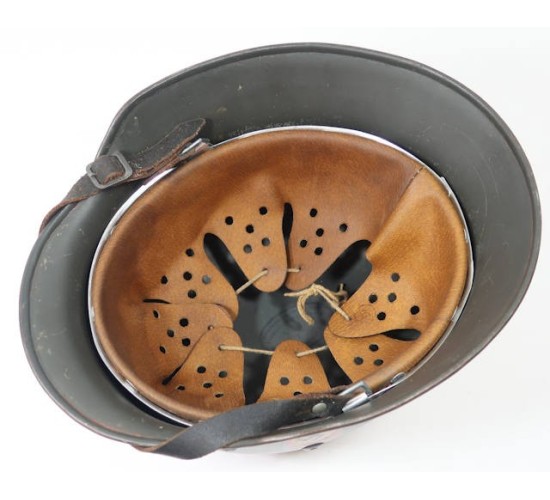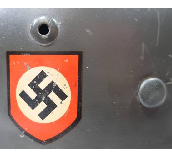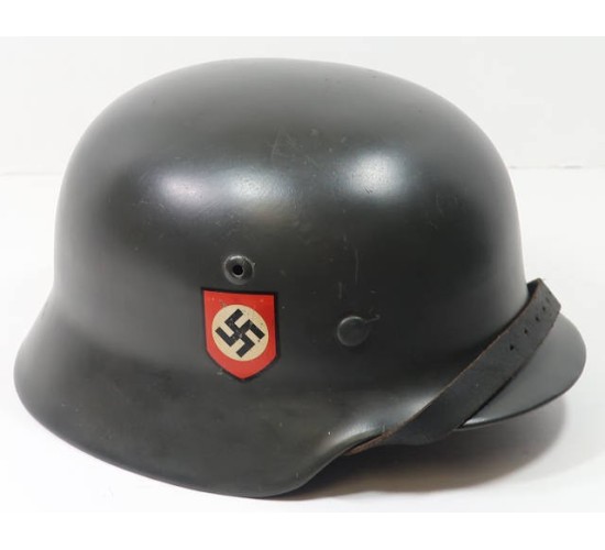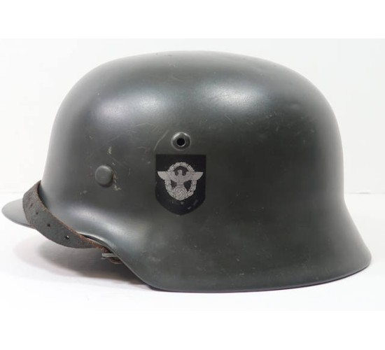 RD684.)GERMAN POLICE M35 DOUBLE-DECAL COMBAT STEEL HELMET: spectacular old piece of restoration workmanship, as fine as any original. Just a total stunner. An original period steel helmet shell, M35 type with separately applied flanges at sides. Smooth police-green enamel showing only minor age and wear....very, very convincing. You'd swear that this helmet is 100% original. Both decals are high quality old fakes and are expertly applied; the national colors/swastika shield decal appears to be original. Not sure. Underside of shell is die-struck with helmet maker's code and shell size 'NS66'. Rear skirt is die-struck with production code '5928'. Super-fine pigskin leather liner -- and old reproduction of the highest quality, not junk. Leather is convincingly dark from use and age, soft and supple. Has all of the round leather washers and draw string. Ink stamped with liner size '59'. You can discern where the aluminum liner band is marked which is pretty neat. Inside of shell still has blue ink-stamped dome stamping which is '1939' dated and easy to make out. Black leather chin strap (which I believe is an old repro but can't say for sure) is crisply RB numbered on the tip. Ask for more up-close and detailed photos should you be interested in buying this gem quality helmet! EXC+++++