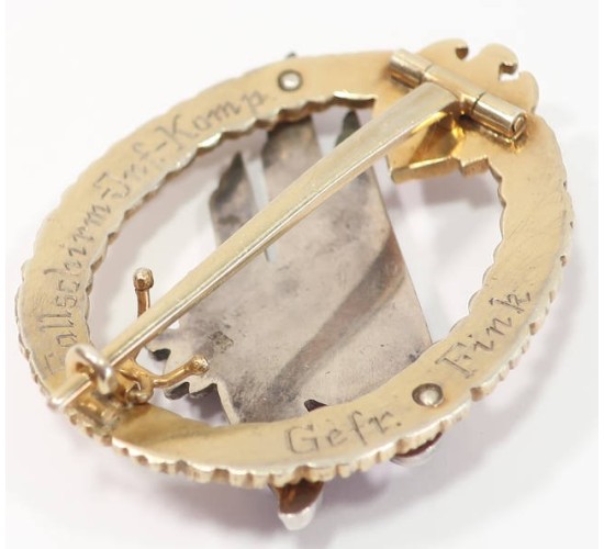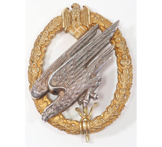 RD688.)GERMAN ARMY PARATROOPER'S BADGE, ENGRAVED AND '800' MARKED: genuine silver composition and '800' marked on the lower reverse. Ask for more up close and detailed photos should you be interested in buying this dangerous, old stunner. Crisp, solid and impressive as hell. Wreath has been frosted with a gold application that just sparkles in sunlight; diving eagle motif is a handsomely toned silver. Note too the crispness of the Wehrmacht eagle motif. Reverse has wide gold hinge and tapered gold pin; two perfectly domed rivets on the back. The 'C' hook catch has a safety latch that's hinged and folds into the pin to lock it in place. Jeweler engraved on the back of the wreath with 'Fallchirm.Inf.Komp.' and name/rank 'Gefr. Fink'. Just a breath-taking old copy, none finer. EXC+++++