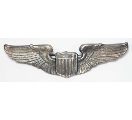 US430.)WWII USAAF PILOT'S WING, MAKER-MARKED: splendid example being the product of the premiere American Emblem Company of Utica, NY. 3" full size and 'STERLING' marked. Darkly toned with years of unpolished patina. Oh, so good-looking. Well detailed, nicely struck. Reverse has horizontal swing pin and roller catch. Marked behind the American shield with crisp, raised relief details 'A.E.Co, Utica, NY'. EXC++++