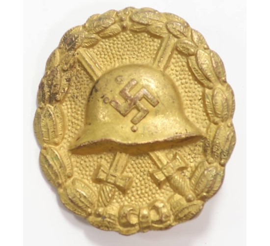 RD927.)1936 SPANISH TYPE WOUND BADGE IN GOLD: Wagner, Berlin marked piece. An old copy circa 1970's and bought years ago as original (of course, these were made to fool). Gold-finished alloy with the gold finish being frosted and burnished. Well detailed and crisp....examine it under a bright light. Impressive. Reverse has high quality hinge and tapered gold pin. EXC++++