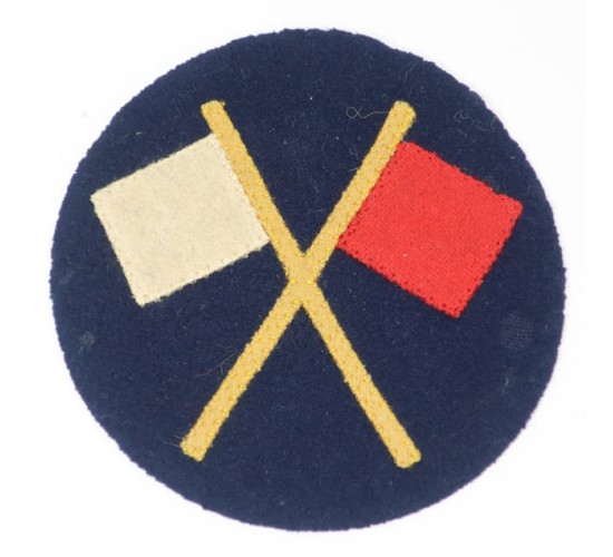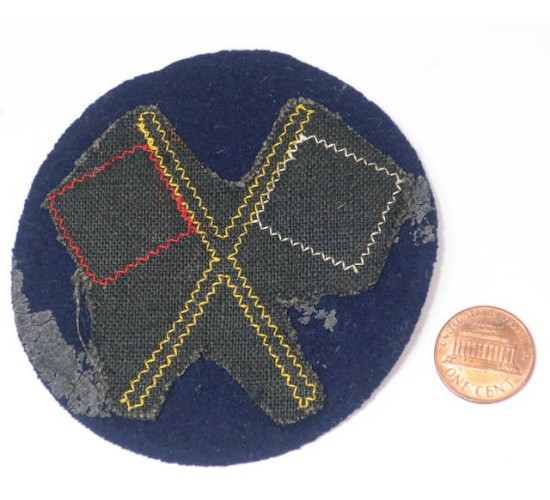 G944.)IMPERIAL PRUSSIAN KAISERMARINE SIGNAL'S RATING: deluxe quality construction, a beautiful patch. 3 1/2" wide dark blue melton cloth wool with separately applied, machine sewn-on, cross signals flags. All of the sewn-on wool components are separate pieces. Back has black canvas-like backing and remains of black tissue paper. EXC++++