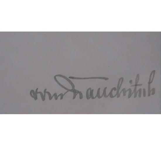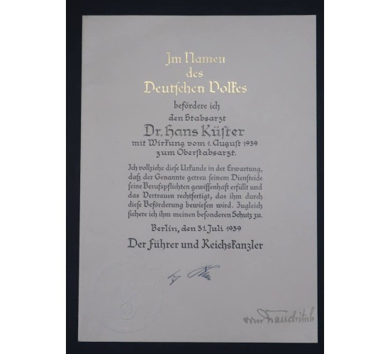 G956.)3rd RCH GERMAN ARMY PROMOTION DOCUMENT: elaborate 20x14" document and folded at center to form four panels. Printed on heavy, quality paper stock. With genuine signature at base -- Generalfeldmarshall Walter von Brauschitsch, the Chief of the German Army High Command. This signature is ink blue india ink. Document has gold embossed title at top 'In Namen des Deutschen Volkes' (In the Name of the German People) and named in perfect hand calligraphy to German army physician 'Dr. Hans Kuster' and dated at 'Berlin 1.August 1939'. Promotes him from the rank of 'Stabsarzt' (staff doctor) to that of Oberstabsarzt (senior staff doctor). With bold embossed national eagle swastika at base and facsimile Hitler signature. EXC++++