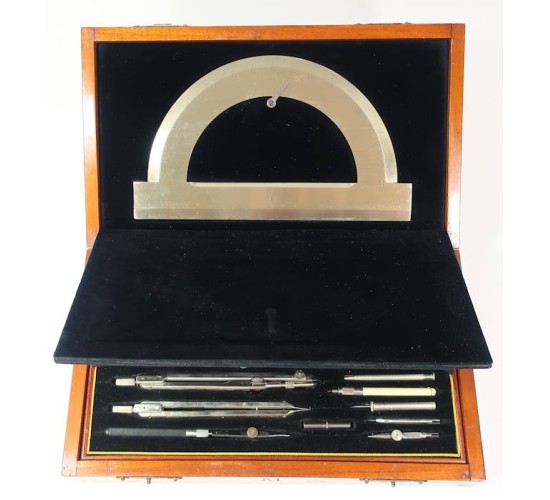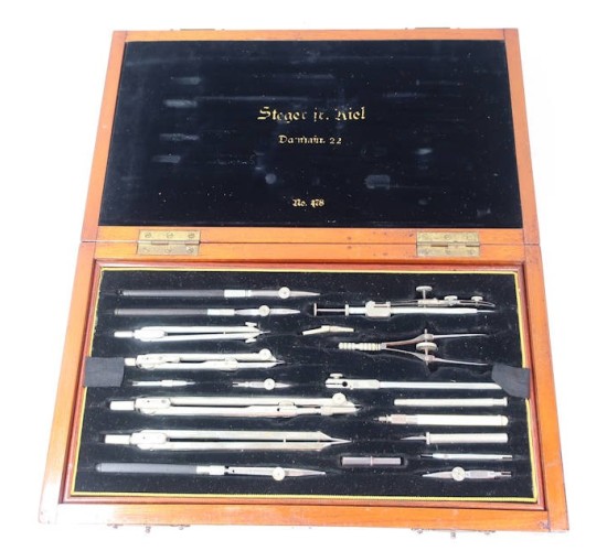 G994.CASED IMPERIAL GERMAN NAVY NAVIGATOR'S INSTRUMENT SET: complete set of all nineteen pieces being dividers, protractors, all the extensions, pieces and parts. I took a few drafting course way back in the day and I used to know the names of all these various drawing instruments. I can still use them pretty effectively but I don't recall what all of them are named. All of these implements are set into a removable black velvet lined tray. Comes in 7x12" brown wooden case, hinged and with latches at front. Dove-tailed wooden construction. Embossed on the lid with imperial Prussian royal crown and letter 'M' for German navy property (Kaisermarine). Upper interior lid is hinged and opens to reveal a 5x9" nickel composition protractor. Tray with instruments is removable too and has compartment below for navigator's utensils....pencils, erasers, etc. Gold printed maker on inside lid 'Steger Jr. Kiel'. Protractor is marked too with this instrument maker. Outstanding imperial German nautical piece. If one of the nautical collectibles guys had this to offer the price would easily be $1,500! EXC++++
