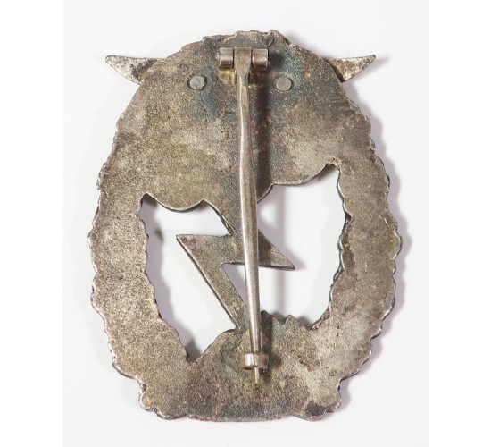 RD999.)LUFTWAFFE NUMBERED GROUND ASSAULT BADGE FOR 100 ENGAGEMENTS: very nice example of what would otherwise would be a fantasy badge as no numbered LW Grd Assault Badges were ever awarded although Forman maintains that some were indeed manufactured. Constructed of a quality silver alloy and heavily darkened with tarnish. Cloud motif and lightning bolt are silver frosted, show rainbow toning. Separately applied LW eagle device at top; two flat rivets on the back. Separately applied '100' shield on the back. Has a quality silver alloy hinge on the reverse, long pointed pin that's tapered. Reverse shows lots of rainbow tarnishing. EXC++++
