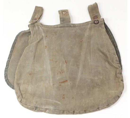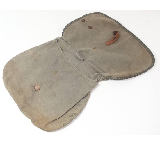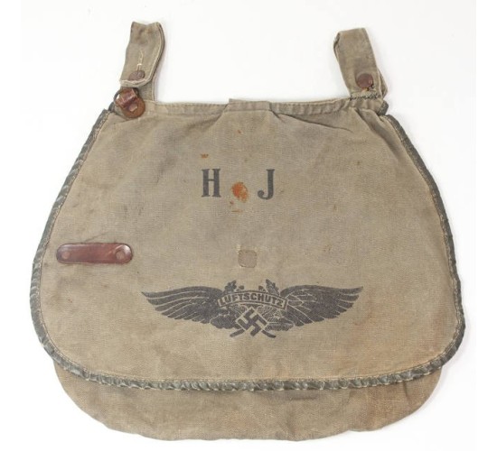 G330.)HJ/LUFTSCHUTZ RATION BAG: without question this ration bag is genuine period although I have to say that we have never seen another. It's a typical HJ ration bag, 9x13" dimensions, gray canvas construction. All of the buttons are the HJ type faux braided leather. Has all of the proper leather loops, 'D' rings and hooks. On the front are stenciled letters 'H J' and with black printed Luftschutz wing-swastika emblem. Absolutely no question -- and you'll agree -- that these stencils have been on this bag since 1944. Bag shows age and wear and soiling, some rust staining too. Kind of a period treasure, actually. No rips nor any holes to fabric.