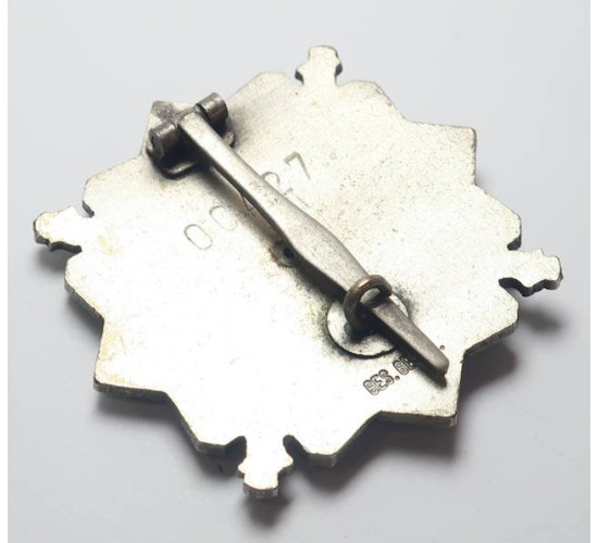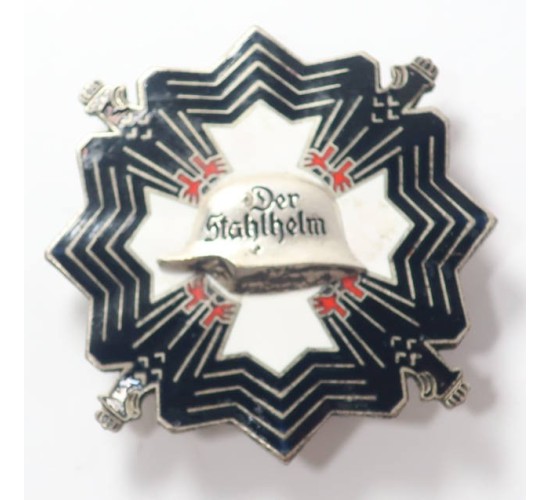 G357.)HYPER-RARE STAHLHELM MILITARY SPORTS CROSS: oh, so rare. This is the World War One Veteran's League 'Steel Helmet' Military Sports Cross known in German as the Stahlhelm Wehrsportkreuz. 45mm wide fine silver alloy base detailed with fine glass enameling. Design shows silver Stahlhelm Badge inside on white glass enamel with black enameled eagles in each quadrant. Reverse has high quality hinge and tapered silver pin. Marked on the back with German design patent protection 'GES.GESCH.' and is die struck with serial numbered to individual recipient '00427'. Has single rivet on the reverse. EXC++++
