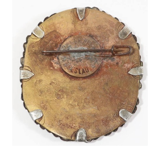 RD368.)1934 NSKOV (DISABLED WAR VETERANS) DAY BADGE: multi-piece, large, day badge with stamped aluminum details, crimson wool backing fabric and with brass plate crimped on the reverse. Badge has Iron Cross design with NSKOV motif and swastika. Inscription is 'KREIGSOPFERTREFFEN-BRESLAU' (War Wounded Veteran's Rally at Breslau). With '3.6.1934' date. This badge is 2 1/2 x 2 1/2" dimensions. Brass backing plate crimped into place and with typical German spring clip pin-back. Marked to maker 'BRINKMANN, BRESLAU'. EXC++++