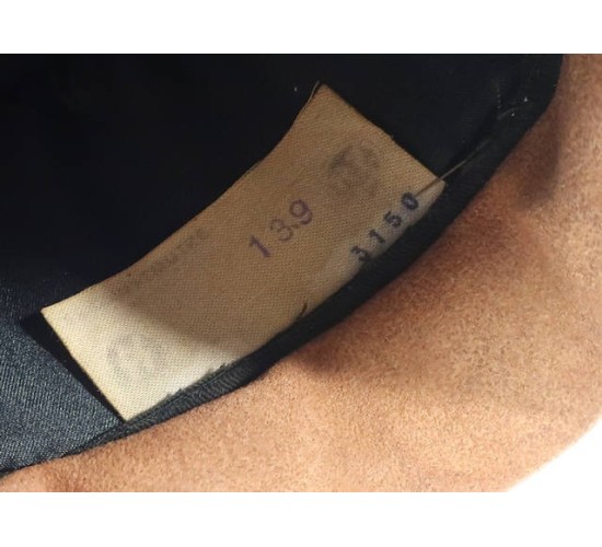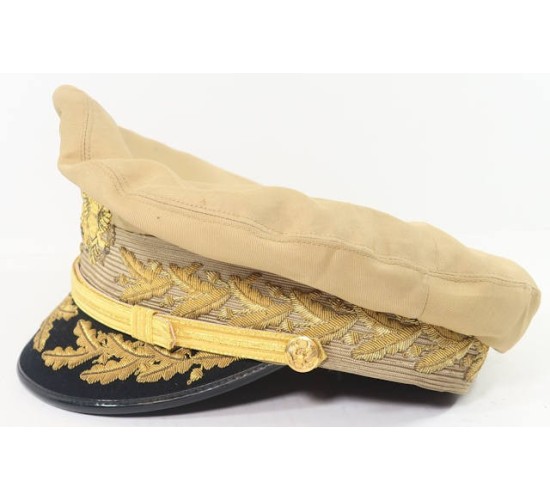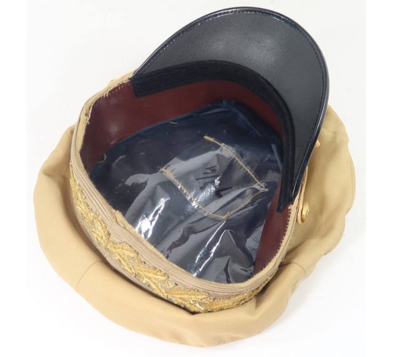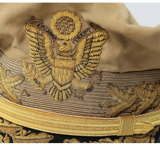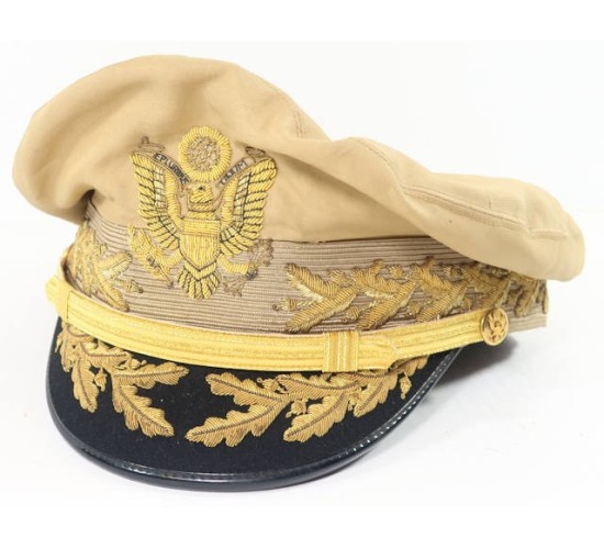 RD374.)DOUGLAS MacARTHUR WARTIME VISOR CAP: fabulous old copy of General of the Army Douglas MacArthur's wartime visor hat, the piece of US Army headgear unique to him. Summer weight khaki cotton body, a true crusher shape and profile. American eagle at front is hand embroidered gold bullion wire. Note that the E Pluribus Unum motto is done is impeccably done in hand embroidered black thread. Cap has khaki wool cap band which is likewise hand embroidered with gold bullion acanthus leaves. Black wool covered visor has hand embroidered gold bullion acanthus too. All of the gold bullion wire embroidery is attractively toned from the years. Gold general officer's chin strap fastened at sides with frosted gold American eagle buttons. Interior of cap is lined with black satin-like fabric and has clear moisture shield, ersatz brown fabric sweat band. Clean, shows mild age from the years. EXC++++