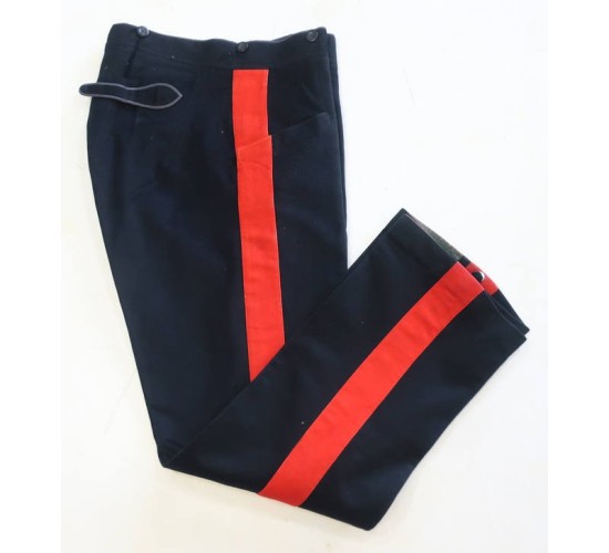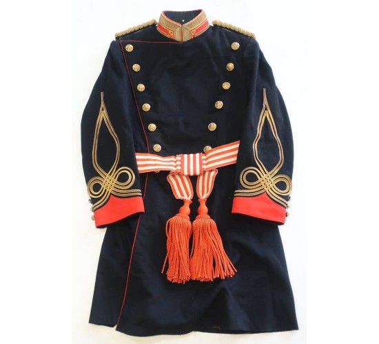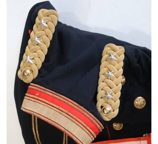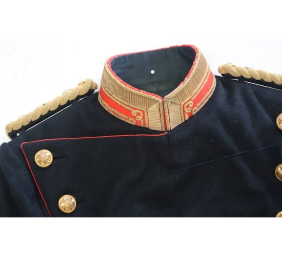 OC390.)WWII IMPERIAL JAPANESE ARMY OFFICER'S DRSSS TUNIC AND TROUSERS: a totally spectacular piece of workmanship. Exquisitely tailored of an officer quality melton cloth wool, 14 frosted gold chrysanthemum button front and piped with crimson wool down the front panels. Magnificently tailored. 2" tall stand-up crimson wool collar embellished with stunning gold bullion hand embroidered workmanship. Slip-on gold bullion braided cord shoulder boards are original to this tunic. Each has three separate silver star rank devices for Imperial Japanese Army captain. At cuffs are gold bullion quatrefoil embellishments, crimson wool with three gild chrysanthemum buttons each. Rear is pleated with crimson piping, frosted gold chrysanthemum buttons. Inside is machine embroidered Japanese tailor's label 'OTSU, TOKUMOTO'. There are five long loops on the chest for medal bar (this series of loops is 6" long). With 2" wide officer's sword sash having tassels at front. Minor wear to this sash. Matching trousers with 2" crimson stripe down the side, slash pockets at front. With buttoned fly at front. Tunic is about a US size 36 and the trousers have a 36" waist. Ask for more up-close and detailed photos should you be interested in buying this uniform. Mothing along the piping on the stand up collar and a few moth nips to wool here and there. EXC++++