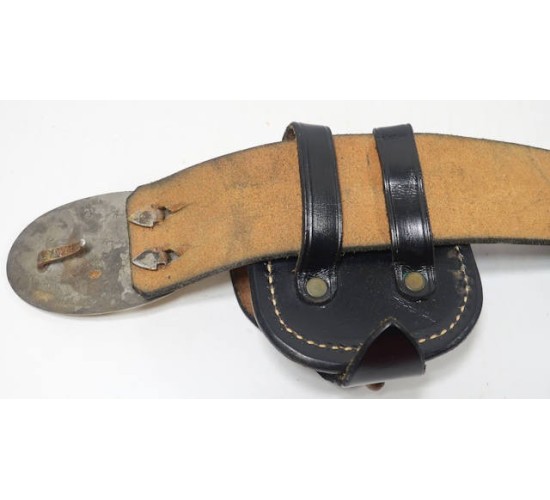 US405.)CIVIL WAR UNION ARMY ENLISTED RANKS BELT AND BUCKLE: an older copy of the highest quality. Includes the cap box for the infantry rifle. Belt is 34" long black leather, soft and supple and intact. Buckle is a really, really fine replica....well detailed with bold raised relief 'US' in oval and the correct lead-filled back. Has so-called 'puppy paw' clasps on the back. Heavy as it should be. Both the belt and cap box are 'Lawrence' maker marked. EXC++++