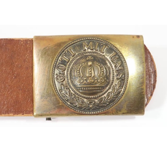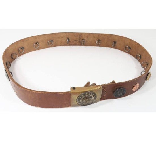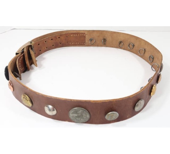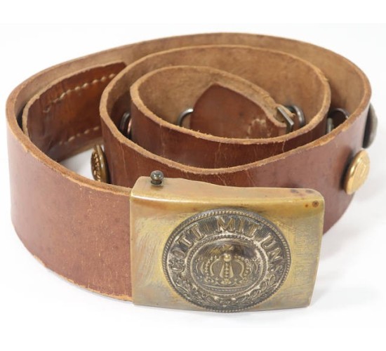 G448.)WORLD WAR ONE GERMAN 'HATE BELT': German army enlisted ranks field service belt in a really good state of preservation. 2" wide brown leather and 38" long. Buckle is a really nice example...Prussian army enlisted ranks brass buckle with separately applied -- and now darkly toned -- silver crown device in center with 'GOTT MIT UNS'. A really beautiful buckle. With sixteen (16) buttons all applied with round cotter pin fasteners on the back. Buttons are all WWI period: German regimental shoulder buttons (with regimental numbers); German imperial army buttons (crown), Austrian army (eagle); British Commonwealth (Australian); French medical officer's (frosted gold); large Bavarian army tunic button; French Corps of Cadets (which we added as a period replacement for one button that was missing). Underside of belt has brown leather tab with adjustment holes for tightening and this tab too is soft and supple and perfect, stitching too is intact and strong. Nice belt. EXC++++
