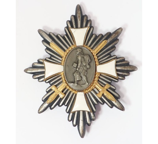 G453.)1914-1918 HAMBURG HONOR CROSS: super-fine example. 53mm wide and vaulted. Constructed of nickel-silver alloy and with separately applied infantryman in the center. White enamel cross superimposed and with frosted gold crossed swords. Reverse has high quality hinge and typical cotter pin type clasp. Reverse has two brass rivets and is marked with 'Deutsches Feld-Ehrenzeichen' (German Field Honor Cross). Couple of absolutely tiny and miniscule hairlines to white enamel, not detracting at all. EXC++++