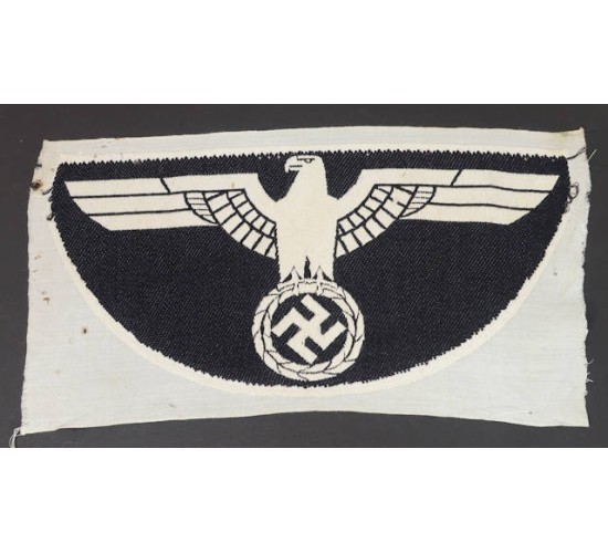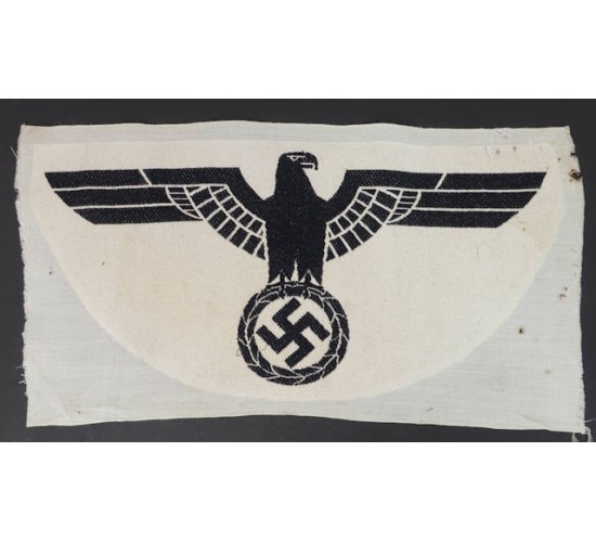 G454.)GERMAN ARMY SPORTS SHIRT EAGLE: black machine embroidered eagle motif on un-cut 5x10" white cotton. Intact but for a couple of minor rust spots in the upper right corner. EXC++