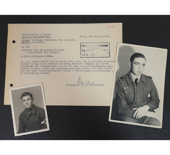 G464.)HJ FLAK BATTERY VOLUNTEER'S DOCUMENT AND TWO PHOTOS: document is 6x8" with typed details and is dated '16.10.1944'. This document is addressed to the academic director of a Frankfurt high school for boys 'Direktor der Kraischgua-Schule, Oberschule fur Jungen' and states that four boys have been excused from school and are serving with a Luftwaffe air defense flak battery. The four boys are named in the document and it is signed at the bottom by Luftwaffe captain and flak battery commander 'Hauptmann u. Batteriechef'. Note too the ink stamp from the high school showing the the document was received. With two studio photographs showing HJ flak helpers. Note the Luftwaffe HJ Flak Helper's breast eagle with 'LH' letters over eagle 'Luftwaffenhelfer'. EXC++++