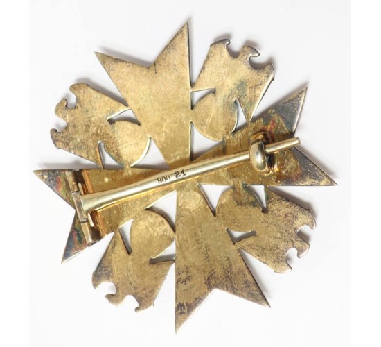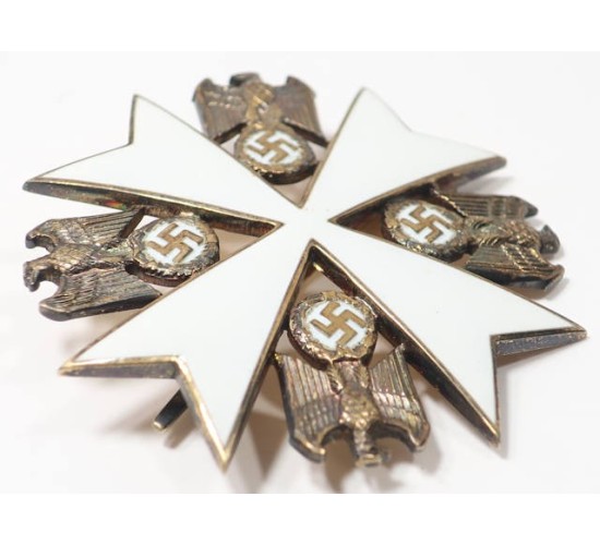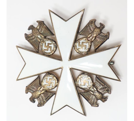 G469.)GERMAN EAGLE ORDER BREAST BADGE WITHOUT SWORDS: spectacular original period specimen, just outstanding. 51mm wide from point-to-point and slightly vaulted construction. Detailed with flawless white glass enameling. Crisp and perfect national eagle motifs in each quadrant and these too are adorned with white enamels behind swastikas. Reverse is handsomely toned with sterling tarnish. Oh, so handsome. Has 12mm wide high quality silver hinge and tarped silver pin that's crisply die-struck with silver content '900' and maker's code '21' for the premiere Godet firm of Berlin. EXC++++