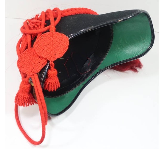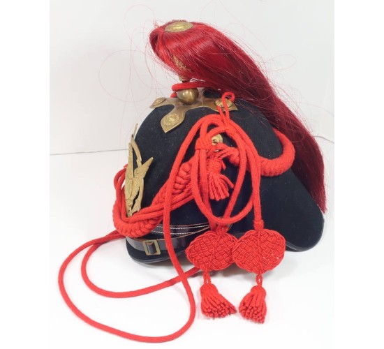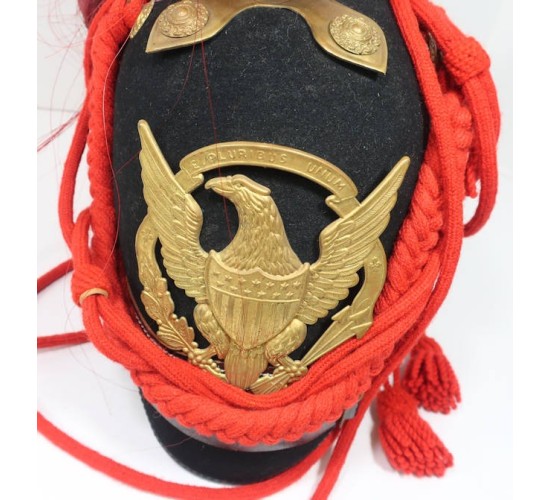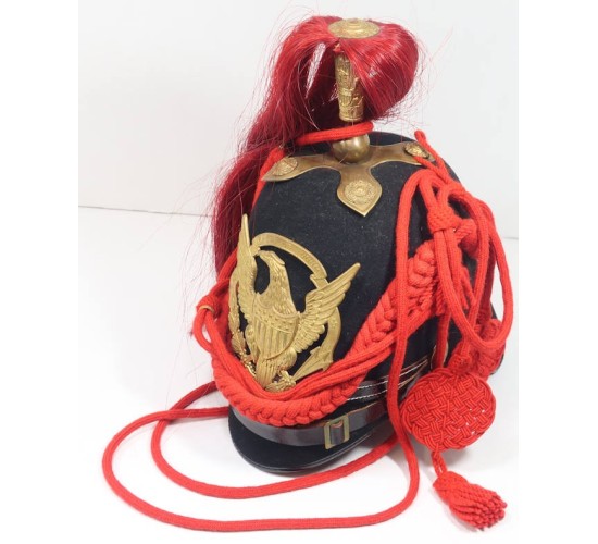 RD497.)US ARMY INDIAN WAR ERA M1888 ARTILLERY ENLISTED RANKS DRESS SHAKO: a spectacular piece of vintage workmanship displaying a perfect profile and shape. I don't know who made these, where they were made or during what time period but this replica dress shako is as fine as any original. Many years ago I collected these (originals) so I know them well. This is a gem quality piece. Dark blue wool body on hard body and with black ersatz leather trim around both visors, front and back. At front is a quality stamped brass American eagle plate...as fine as any original. Crown has decorative crimson horsehair plume mounted to brass post that's adorned with American eagle shield. Note that this post is mounted to star form pedestal. One of the four decorative medallions on this quatre-form pedestal is missing. You can replace it by going to any hardware store and buying a large upholstery tack (I have done this in the past with very satisfying results). Black leather chin strap snugly fitted above the front visor has has brass adjustment buckle. Fastened at sides with brass buttosn being the artillery type with crossed cannons. Has the decorative crimson braided cord adornment properly fastened at sides of helmet and with long cords and so-called 'waffles' that were fastened to artilleryman's tunic buttons (so as not loose the helmet when riding). Undersides of each visor lined with green fabric and inside of helmet has ersatz leather sweat band. EXC++++