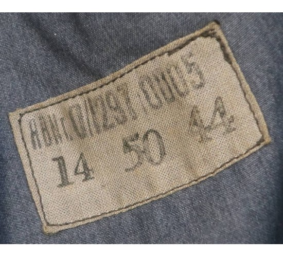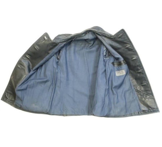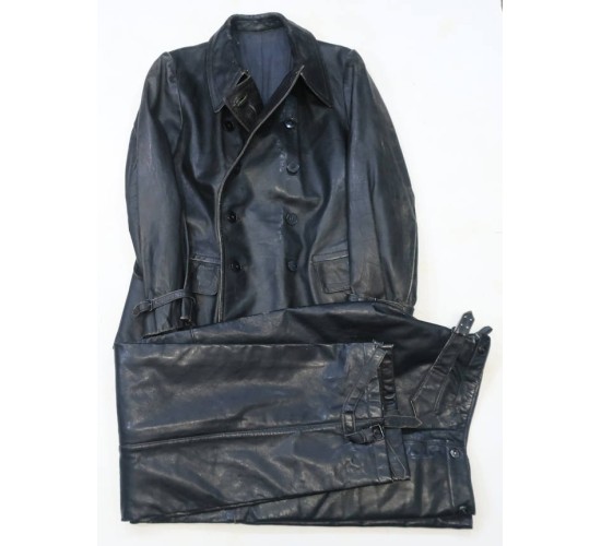 G530.)KRIEGSMARINE DECK LEATHERS, JACKET AND TROUSERS: smooth dark gray fine quality leather jacket with double-breasted front, black composition buttons. All ten buttons at front are present. Wide collar with pointed lapels, has double buttoned leather tab beneath front for securing at neck. Pockets at hips with leather flaps. Note too the leather adjustment tabs on the bottom of each sleeve with metal tightening buckles. Inside of jacket is lined with brushed blue cotton fabric, wide inside pocket too. Has cloth label inside printed with size dimensions and RB number. Matching leather trousers with metal buttons along the belt line for suspenders, buttoned fly too (missing one black composition button) and with metal catch too. Slash pockets at sides, buckled leather tab at rear waist for tightening. On the bottom of each leg are ankle straps and buckles for tightening. Inside of trousers lined too with the same blue brushed cotton and has cloth label also with printed size dimensions and RB number. In a good state of preservation overall; leather is soft and supple and shows light wear and age from use. Jacket is about a US size '34' and the trousers have a 32" waist, 28" inseam. EXC++++
