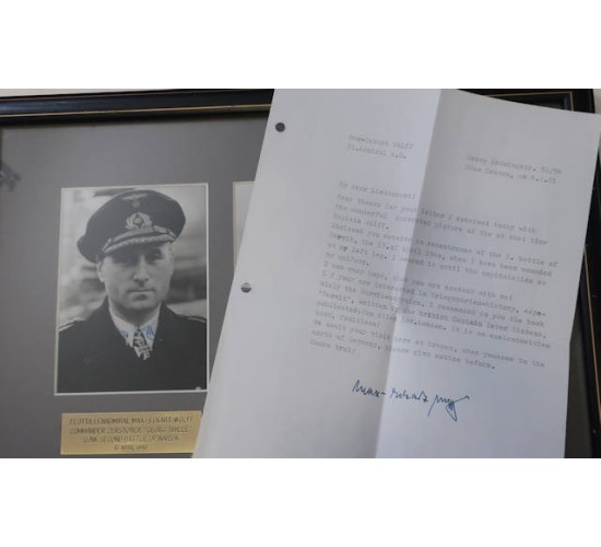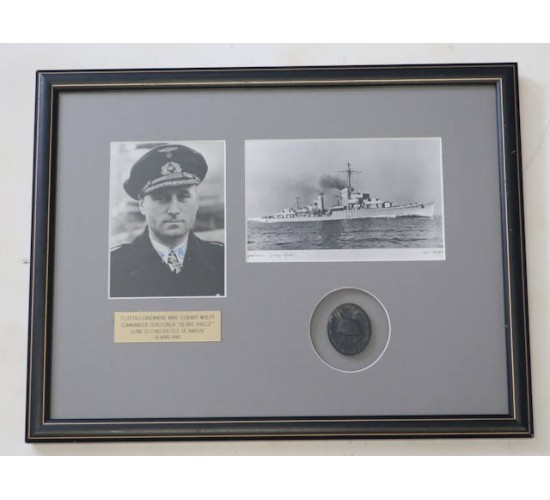 G536.)FRAMED SIGNED KC RECIPIENT'S PHOTO AND '39 WOUND BADGE: kind of an extraordinary offering being a professionally framed grouping belonging to Kriegmarine officer and '39 Knight's Cross recipient Max-Eckart Wolff, commander of the German destroyer 'Georg Thiele' which was sunk by British forces during the 1940 2nd Battle of Narvik. Comes with 1981-dated, typed, letter from Max-Eckart Wolffe to an American officer and references Wolffe's gift to him of his 1939 Wound Badge in Black which is indeed framed with this grouping. 12x16" smooth black-finished wooden frame with decorative gold lines and behind glass. Has wire hanger on back and typical professional framer's brown kraft paper. Framed with high quality and beveled gray mat board...showing photo of Eckart-Wolffe in uniform and wearing his '39 Knight's Cross. This photo has genuine autograph in blue ink. Photo reprint and autograph are post-war of course. Also a photo of Eckart-Wolffe's destroyer underway at sea. Below is Eckhart-Wolffe's 1939 Wound Badge in Black which he attests in typed letter was his and awarded to him for a wound received during the Battle of Narvik. This badge shows some brown oxidizing. EXC+++