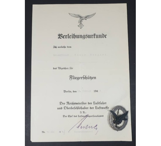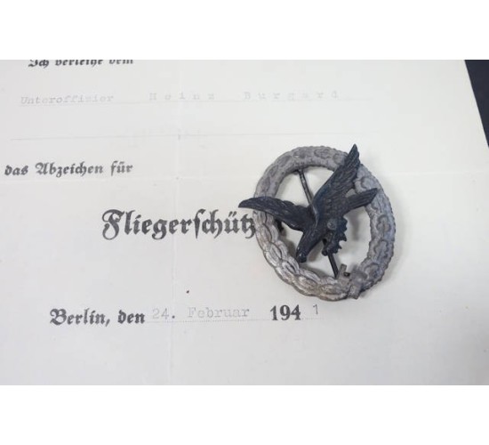 G542.)LUFTWAFFE AERIAL GUNNER'S BADGE AND AWARD DOCMENT: badge has been examined by two expert and approved as genuine period. It's a wartime piece with gray alloy wreath, cut-out swastika. Shows toning to a gray cast. Diving eagle motif is blackened alloy. Has two perfectly domed rivets on the back, hinge is integral to badge's construction. Marked on both the back of the wreath and on the eagle with the stylized letter 'A' logo (looks like a protractor) of the Assmann & Sohne firm. Has long, blunt pin. Formal award document is 8x11" dimensions and printed on fine quality paper stock. Has been folded. At top is LW eagle motif and 'Berleichungsurkunde' (award document). With typed name to NCO 'Unteroffiziere Heinz Burgard' and dated at Berlin '24.Februar 1941'. Awards him the Luftwaffe 'das Abzeichen fur Fliegerschutzen'. Signed at the bottom by Luftwaffe general officer and Chief of the Luftwaffe Personnel Office. EXC++++