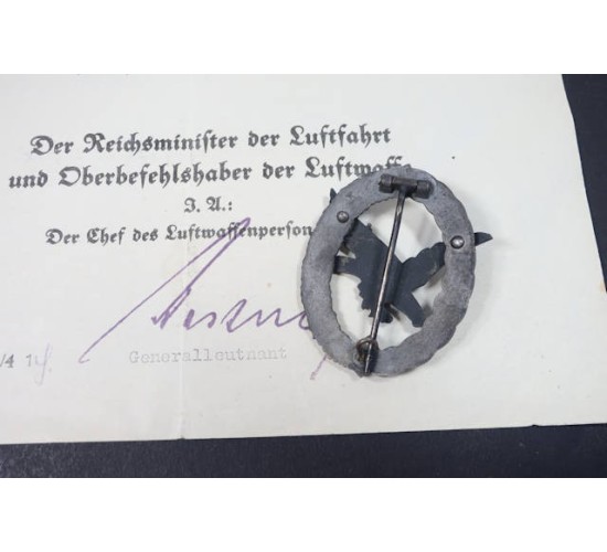 G542.)LUFTWAFFE AERIAL GUNNER'S BADGE AND AWARD DOCMENT