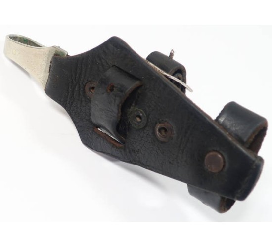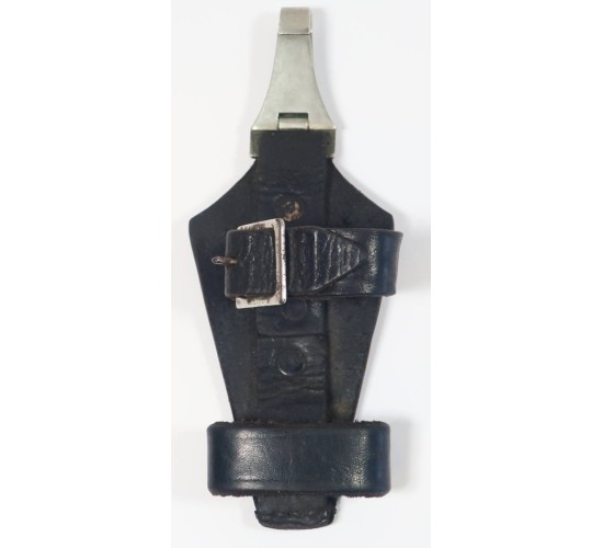 G547.)SS DAGGER HANGER: an early example, so-called 'vertical' type hanger. Black leather construction, soft and supple. Intact rivets and magnetic buckle, nickel-plated spring clip mounting. Intact, soft and supple although it shows wear and age from having been mounted to a dagger. Not marked in any way, early, pre-RZM type. EXC++++