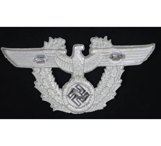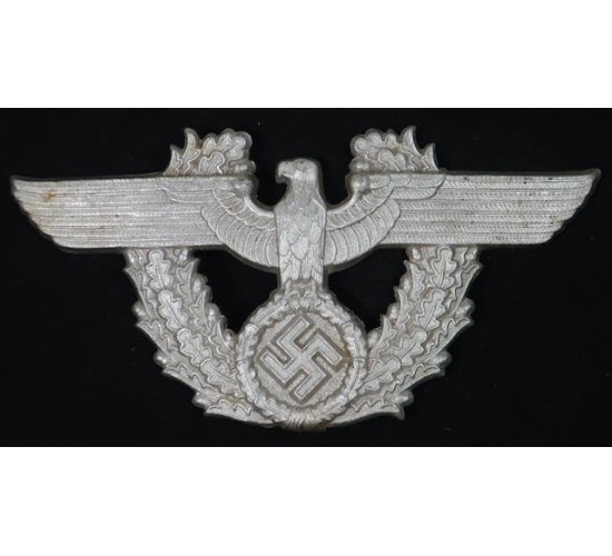 G552.)POLICE DRESS CARTRIDGE BOX EAGLE PLATE: 50x100mm (2X4") stamped aluminum, slightly vaulted in construction. Missing one of the three loops on the back. Marked on the reverse of the eagle's chest with the stylized letter 'A' logo of the well known Assmann firm. EXC++++