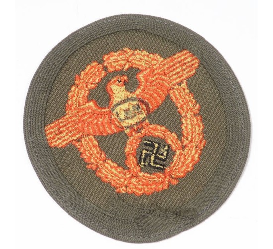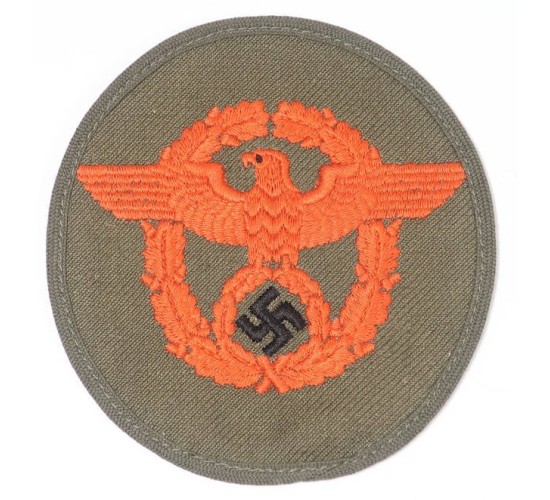 G556.)GERMAN ARMY MILITARY POLICE SLEEVE EAGLE, TROPICAL: very desirable example being for the German military police summer weight tunic. With orange thread machine embroidered police eagle motif on tropical-brown twill. Has reinforced border machine sewn in place. Has maker's ink stamp on the back. Does not glow under a black light. EXC++++