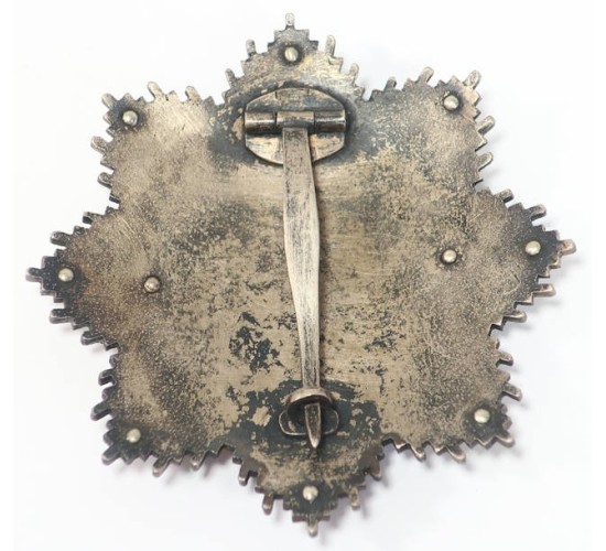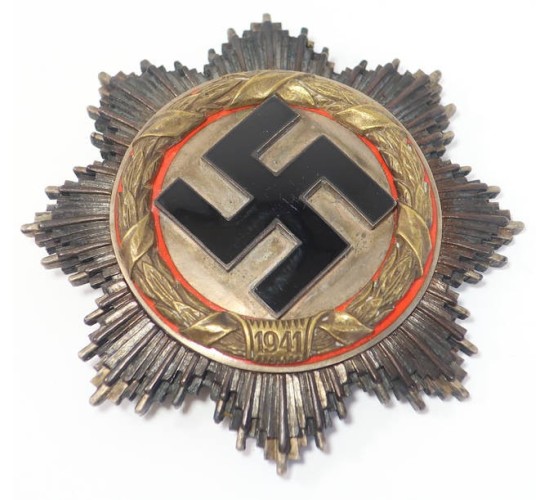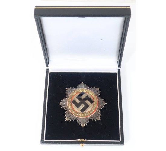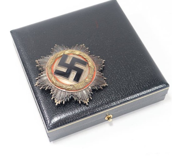 RD574.)CASED GERMAN CROSS IN GOLD: a spectacular old copy and one made to deceive for sure. I can't praise this one enough. It's properly constructed in every respect; it's mellowed and aged and just radiates originality. The previous owner bought this gem forgery some years as original of course. Oh, and the case is an addition of ours. It looks great too. 63mm wide from point-to-point and correctly constructed of the five major parts and components (not including the hinge/pin assembly). Black glass enameled swastika with nickel-silver alloy base and mounted on now tarnished silver disc. Note that this disc is toned with a handsome rainbow patina. Stamped wreath is crisp and perfect; has the nine vertical bars on the '1941' scroll. Red border too on either side of the wreath. Starburst is double-layered with burnished upper level and silver frosted secondary layer. Reverse is a nickel-silver alloy and nearly black with tarnish. So unbelievably convincing. Quality nickel-silver hinge with tapered nickel-silver pin, quality 'C' hook catch. With perfectly domed and flawless rivets on the back. Case is 4 1/2 x 4 1/2" black leatherette and is hinged with functioning spring button catch at front. Gold border around the top of the case. Interior of case is lined with plush black velvet and is recessed to perfectly accommodate hinge/pin assembly. Upper interior is lined with padded white satin. EXC+++++