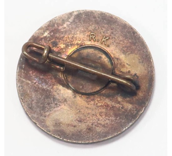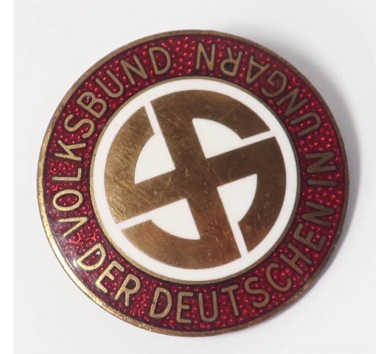 RD575.)NSDAP HUNGARIAN MEMBERSHIP ENAMEL BADGE: fine old copy, dangerous. 22mm wide with flawless glass enameling on coppery-brass base alloy. Unbelievably fine quality. With gold mobile swastika in the center and inscription around the red cloisonné glass enameled border 'VOLKSBUND DER DEUTSCHEN IN UNGARN' (People League of Germans Living in Hungary). Reverse has typical German spring clip pin-back and maker's mark in raised relief letters 'R.K.' This one came out of collection. EXC++++