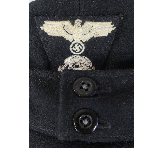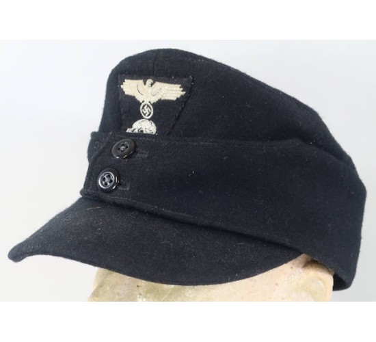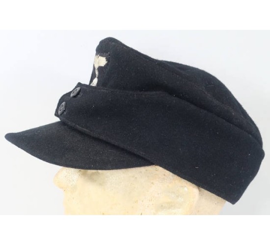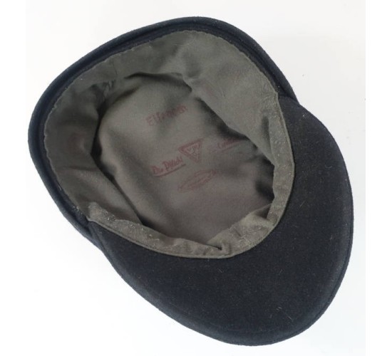 RD577.)WAFFEN-SS PANZER ENLISTED RANKS M43 CAP: nice example, an old, vintage piece of tailoring and one made to fool. It still has the original dealer price tag on it ($3,000 and I'm not kidding!). Properly constructed in every respect and tailored of a quality black wool. Shows a perfect profile and shape; two 14mm wide black composition buttons at front. At front is separately hand sewn on W-SS M43 cap eagle which is machine embroidered on black trapezoid. Embroidered details are off-white thread and mildly soiled from the years. Interior of cap is lined with gray brushed cotton and is ink stamped with multiple maker's marks 'Eisenbach' and 'Die Pflicht'. About a European size 59 if not a tad larger.
