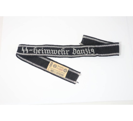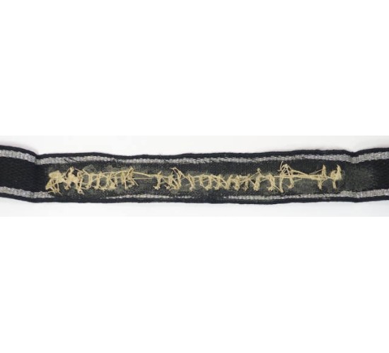 RD580.)SS-HOME GUARD DANZIG OFFICER'S CUFF-TITLE: exceptional quality older copy, circa 1970's. 17" full length and 27mm wide with impeccably hand embroidered silver bullion details 'SS-Heimwehr Danzig' (Danzig Home Guard). Machine embroidered with seven strand silver metallic borders top and bottom. Reverse has aged paper RZM tag. EXC++++
