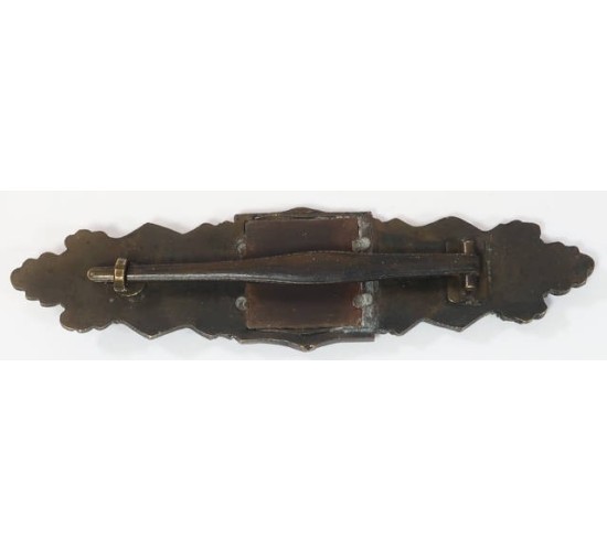 RD584.)CLOSE COMBAT CLASP IN BRONZE: an exceptional old forgery. Constructed of the proper chocolate-brown finished wartime alloy. Crisp and impressive. Slightly vaulted construction and correctly dimensioned at 24x96mm. This old gem is spectacular and we had to consult two other experts just to doubly-confirmed that it's not genuine period. Magnetic backing plate on the reverse and crimped into place. High quality hinge and tapered bronze pin, quality 'C' hook catch. Not marked anywhere. An exceptional old counterfeit and one that you'd assume is quite genuine but for us telling you otherwise. EXC++++