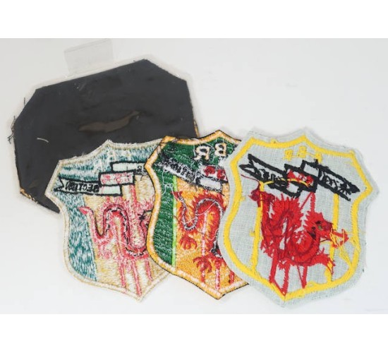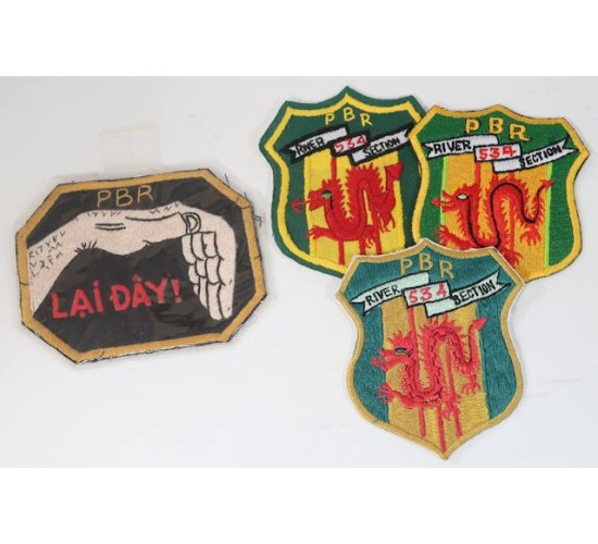 RD585.)FOUR (4) VIETNAM WAR USN RIVERBOAT PATCHES: these come with an interesting story. I was very familiar with the two now-deceased militaria dealers responsible for the manufacture of these fakes...Ron Wolin and George Petersen, both of Virginia. Ron served aboard a PBR patrol craft in the Mekong River Delta back in 1968-69 and it was he who designed both of the originals for these patches. I actually examined several original examples that were Ron's way back in the day....both super-rare and desirable. He designed them himself (I saw the original drawings) and had them made in downtown Saigon by one of the local patch and insignia makers located there. Way back in the 1990's he loaded the two originals to George Petersen who had them reproduced by several of his contacts in Vietnam. With only four crewman per PBR and with only fifteen boats in the section, Wolin would only have to have made less than 100 patches. The patch's design is a shield motif with the US Vietnam Campaign Medal colors along with red dragon and scroll 'PBR River Section 534'. All three of these patches are markedly different in construction, materials used, embroidery. One is actually hand-embroidered while another is machine embroidered on twill (like an old WWII period patch). 'The Lai Dai' piece is actually a pocket patch and is encased in clear plastic film with hanger. Ron Wolin explained to me that it was offensive to the Vietnamese to be waved over (during a river interdiction and inspection). It was appropriate to wave them over with the palm down as shown. The 'Lai Day' call is an on-the-water hail to Vietnamese river craft. These are Vietnamese-made copies of Vietnamese-made originals! EXC++++