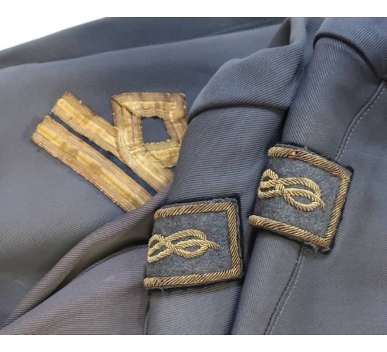 OC606.)WWII ITALIAN AVIATOR'S TUNIC AND FASCIST LEADER'S VISOR CAP: 4-pocket service tunic tailored of a fine officer quality blue-gray wool. Pleated patch pockets above, large cargo pockets below. Four button front and has separate waist belt too with meta adjustment buckle. All buttons are WWII Italian Regia Aeronautica (Royal Air Force) and show royal eagle with king's crown above (remember that despite Mussolini being in power, Italy at time was still a monarchy with a king). On lower cuffs are separately applied gold tresse rank bars -- now tarnished -- being for lieutenant. Has machine embroidered tailor's label inside neck area 'Unione Militaire'. On each shoulder are Italian Air Force bullion wire embroidered epaulettes....these are original to this tunic. You can discern quite clearly where this pilot's wing was in place at one time. I know nothing of WWII Italian aviation items so this tunic 'is what it is' so to speak. I don't see any evidence of it having ever been altered or messed with. Included is what I believe to be an Italian fascist youth leader's visor cap, however your research might conclude otherwise. This one too 'is what it is'. Nice cap tailored of an aviation blue-gray wool and shows a good profile an shape. Construction is padded and bolstered. Cap band is now tarnished gold tresse with aviation sky blue center band. Separately applied gold bullion hand embroidered 'winged' fasces bundle (both silver and gold bullion wire workmanship) and embroidered letters 'GIL" (Gioventu Italiana el Littorio=Italian Youth Movement). Black patent leather visor with dark green underside. Black patent leather chin strap intact and fine and fastened at sides with gold Italian eagle/crown aviation buttons. Has genuine gray leather sweat band -- soft and supple -- and with decorative silk bow at rear seam. Inside of cap is lined with quilted gray satin and is gold-printed with maker 'Coruzzolo'. Couple of scattered moth bites to wool on crown, not serious at all. Nothing on either of these items -- visor cap or tunic -- glow under a black light. Both came together out of a Midwest collection and might have actually been the property of the same officer. EXC++++