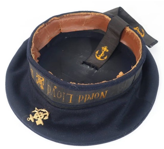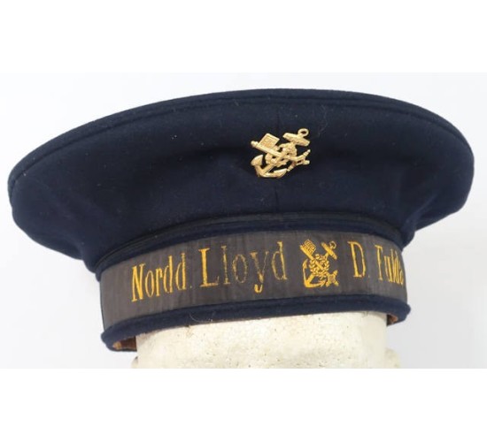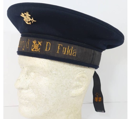 OC607.)1920'S WEIMAR GERMANY SAILOR'S CAP: sailor's cap for the circa 1924 German transport vessel 'Fulda' which was launched from the port of Bremen by the North German Lloyd Shipping Line. Fine quality navy blue wool construction and showing a strong profile and shape. Has gold stamped alloy emblem at front for the North German Shipping Company. Sailor's cap tally is gold thread BeVo machine embroidered on black silk 'Nordd.Lloyd d. Fulda'. This vessel the 'Fulda' was captured in Manchuria by the Japanese at the outbreak of World War Two and converted into a Japanese transport 'Teikoko Maru'. She was part of several Japanese military convoys during the war and sunk by US 5th Air Force B-25 bombers off of the Philippines in December 1944. Comes with printed out history of the steamship Fulda. Inside of cap has brown leather sweat band...shows wear and age from use. Printed too on the inside crown with cap maker 'Willy Sprengfell, Hamburg 22'.